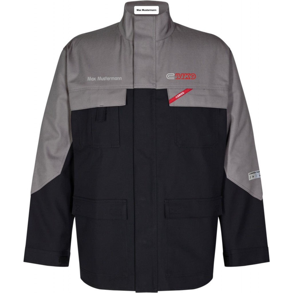 Jacke mit doppelter Knopfleiste und verdeckten Druckknöpfen vorne. Brusttaschen mit Patte und Klettverschluss, die Rechte mit Handytasche, zwei Innentaschen mit Reissverschluss, zwei Seitentaschen mit Patte und Klettverschluss, Manschetten mit Klettverschluss. Eine Rückenfalte sorgt für bessere Bewegungsfreiheit. Funktionelle Details bei Taschen und Bund verhindern das Festsetzen der Funken. Antistatisch, flammhemmend und schützend vor Aerosolen, Spray und leichten Spritzern von Chemikalien.